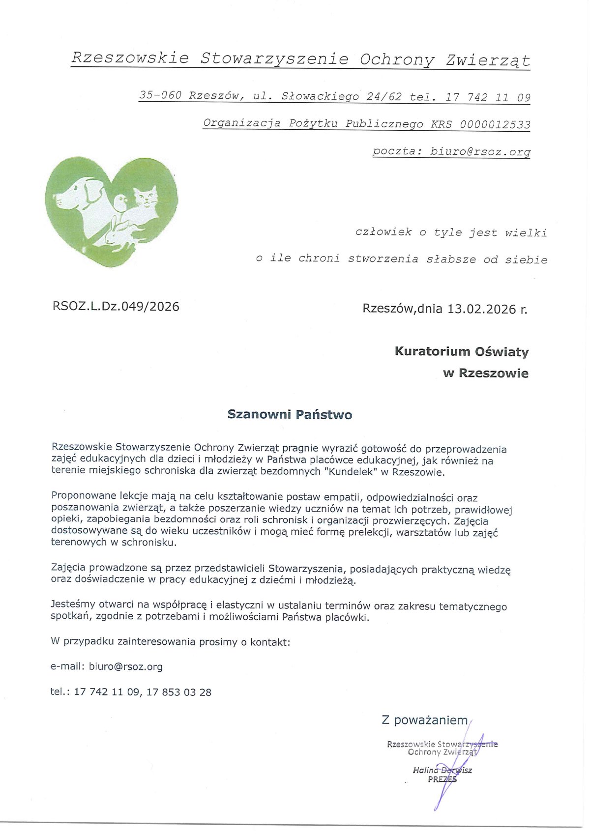 Rzeszowskie Stowarzyszenie Ochrony Zwierząt zaprasza przedszkolaków, uczniów, studentów, rodziców, nauczycieli, dyrekcje szkół oraz wszystkich miłośników zwierząt do udziału w charytatywnej akcji na rzecz bezdomnych zwierząt o udziału w charytatywnej akcji na rzecz bezdomnych zwierząt: "Pomóżmy zwierzakom" 2026