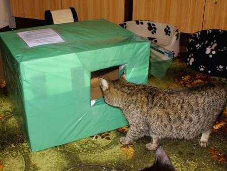 3. Zbuduj domek. Jest to gorsze rozwiązanie aniżeli udostępnienie piwnicy niemniej jednak, kiedy nie ma innych możliwości - domek pomoże kotom utrzymać ciepło ciała. Do budowy domku wystarczy zwykły karton, bądź skrzynki po owocach (szkielet domku), odrobina taśmy przylepnej i styropianu (ocieplenie domku) oraz folia lub cerata (do zabezpieczenia konstrukcji przed wilgocią). Domek nie może być zbyt duży (wielkość powinna być dostosowana do swobodnej zmiany pozycji ciała), powinien mieć również odpowiednio małe wejście zabezpieczone przed wiatrem (14x14 cm). Jako szkielet domku mogą posłużyć także stare meble np. szafki.